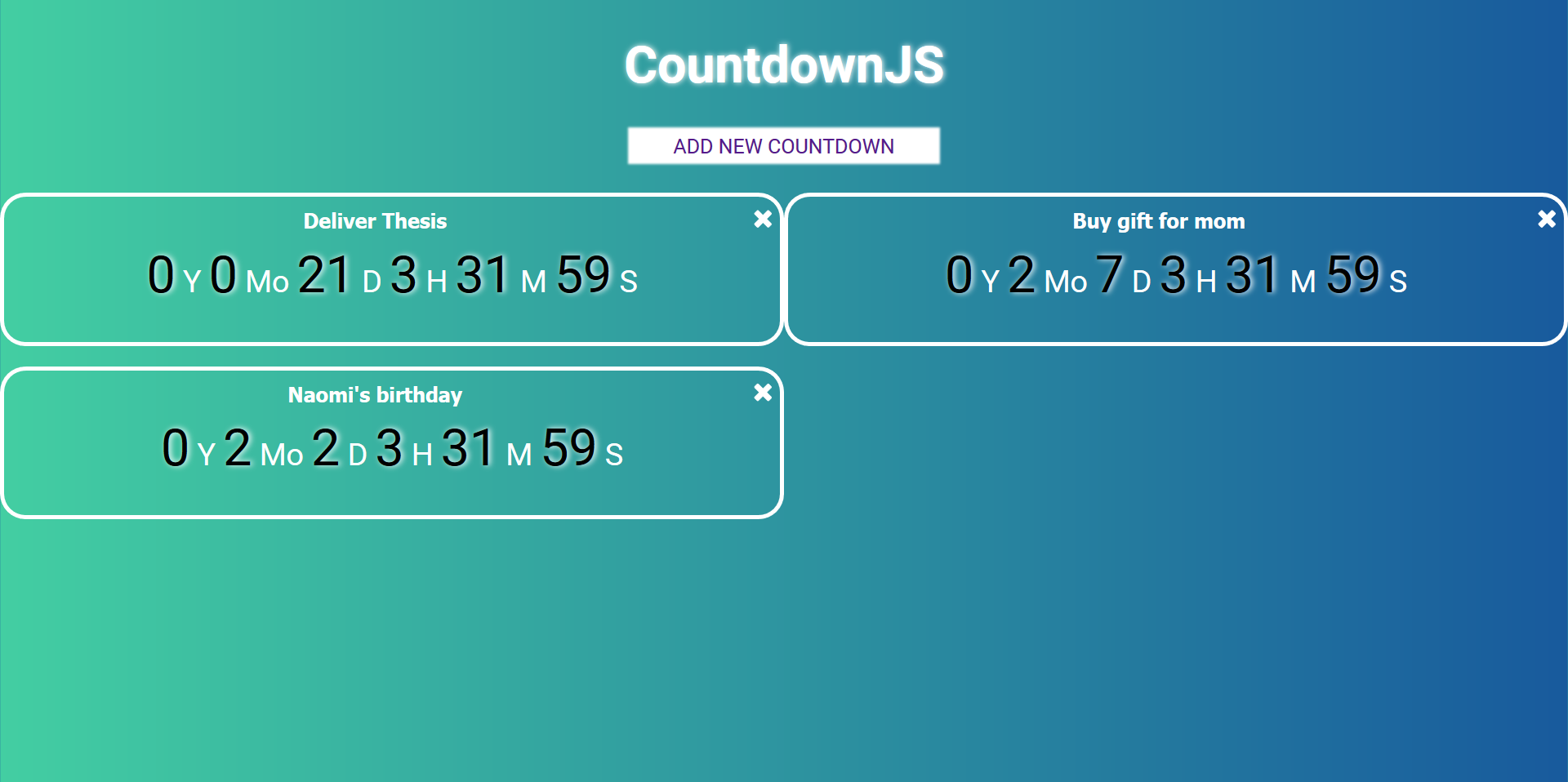 Pure Javascript application to create countdowns to specific events. It uses the Web Storage API.