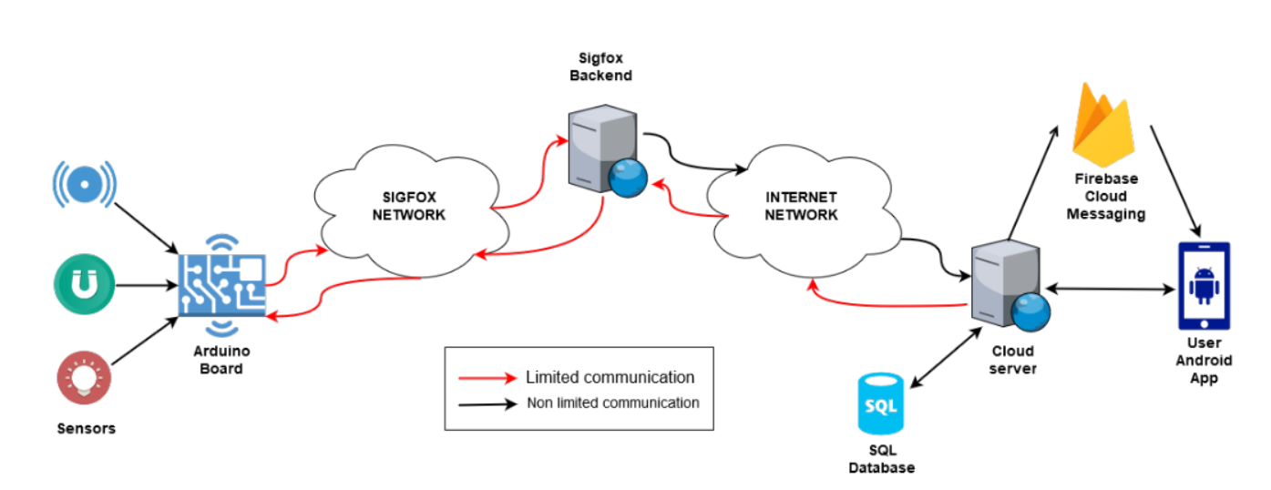 The system is able to detect intruders using proximity and light sensors. The alarm can be enabled/disabled using an RFID tag. In case of intrusion a notification is sent to an Android application through a Sigfox network. A cloud server running Django is used to store configurations and upload them to the Arduino board.